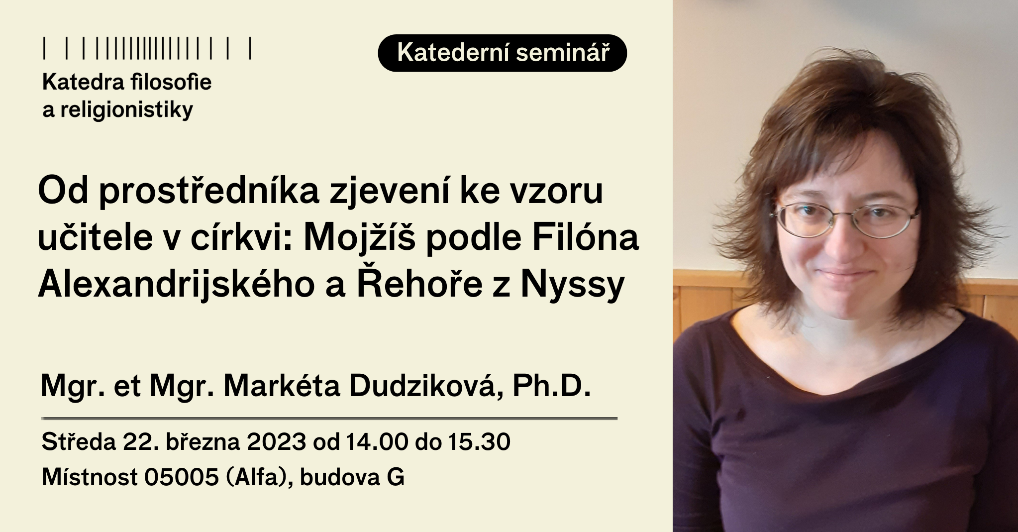 Katedra filosofie a religionistiky Pardubice Vás srdečně zve na další přednášku v rámci Katederního semináře, na kterém vystoupí Mgr. et Mgr. Markéta Dudziková, Ph.D. s příspěvkem "Od prostředníka zjevení ke vzoru učitele v církvi: Mojžíš podle Filóna Alexandrijskéjo a Řehoře z Nyssy."