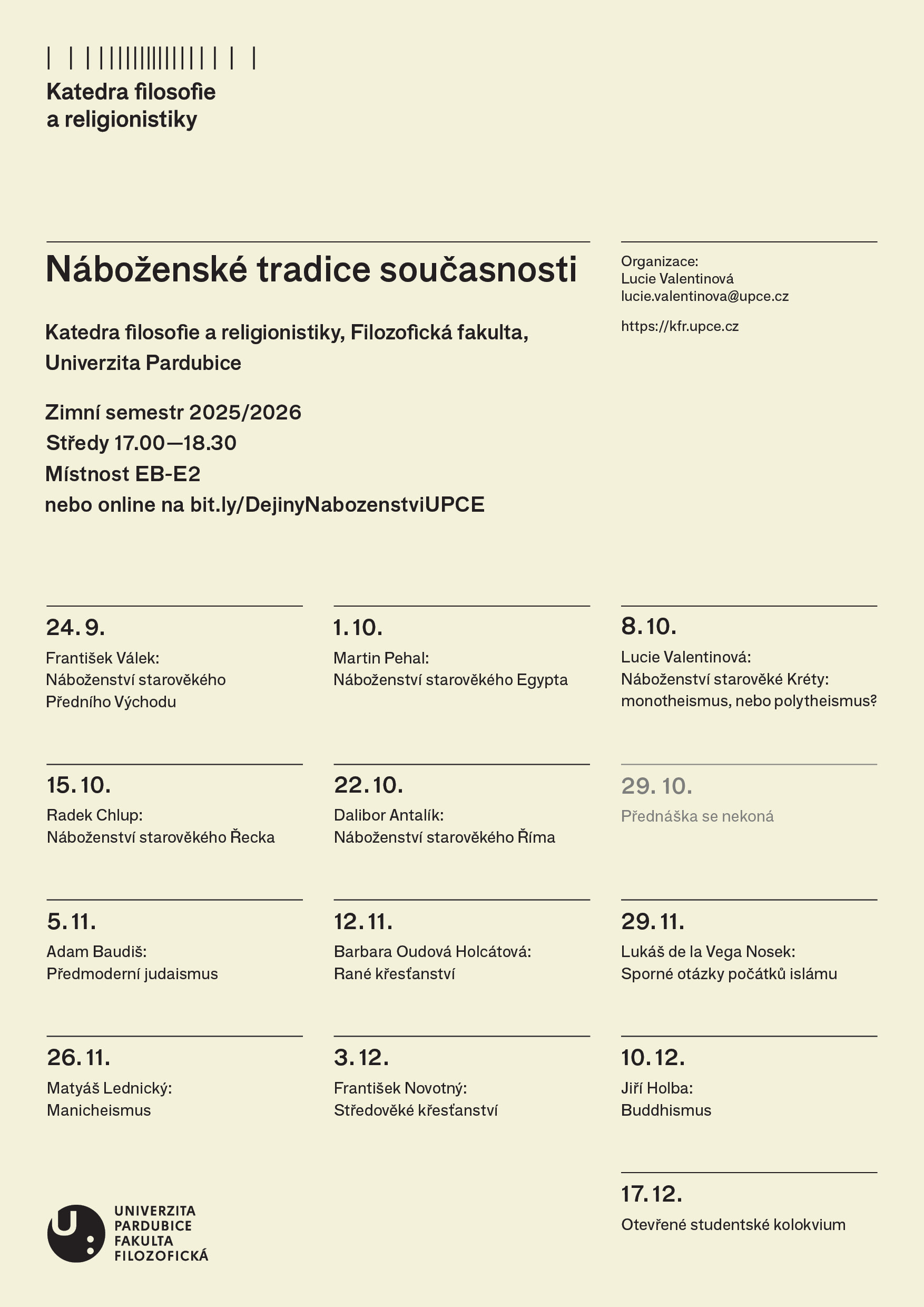 Katedra filosofie a religionistiky Pardubice pořádá již tradiční přednáškový cyklus k dějinám náboženství, který má formu pravidelných přednášek následovaných diskuzí.